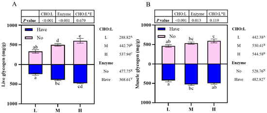 Effects of carbohydrase supplementation on glycogen content in hybrid grouper fed different CHO:L ratios diets (Figure 1A = Liver glycogen; Figure 1B = Muscle glycogen). Data represent means of three fish in each group; error bar indicates S. D. Average of different superscripts in the same column (a, b, c, d, e, etc. Or A, B, C, etc. Or X, Y) are significantly different (p < 0.05). (Dietary CHO:L ratio = A, B, C, etc.; Dietary carbohydrase = X, Y); no means no enzyme, have means enzyme.
