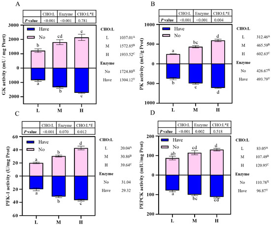 Effects of carbohydrase supplementation on hepatic enzyme activities in hybrid grouper fed different CHO:L ratios diets (Figure 2A = GK activity; Figure 2B = PK activity; Figure 2C = PFK-1 activity; Figure 2D = PEPCK activity). Data represent means of three fish in each group; error bar indicates S. D. Average of different superscripts in the same column (a, b, c, d, e, etc. Or A, B, C, etc. Or X, Y) are significantly different (p < 0.05). (Dietary CHO:L ratio = A, B, C, etc.; Dietary carbohydrase = X, Y); no means no enzyme, have means enzyme.