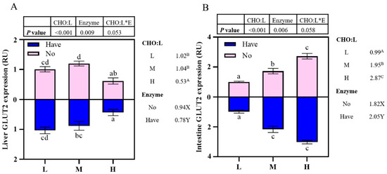 The effects of carbohydrase supplementation on glut2 mRNA expression in hybrid grouper fed different CHO:L ratio diets are shown in Figure 3. The relative expression of glut2 mRNA in the liver decreased significantly with an increase in dietary CHO:L ratio (p < 0.05), reaching the lowest value in Group H. In addition, the presence or absence of carbohydrase caused significant effects on hepatic glut2 expression (Figure 3A). High dietary CHO:L level significantly promoted glut2 expression in the intestine (p < 0.05), and carbohydrase resulted in significant differences (p < 0.05). Interactions between dietary CHO:L levels and carbohydrase were absent in both liver and intestinal glut2 expression (p > 0.05).