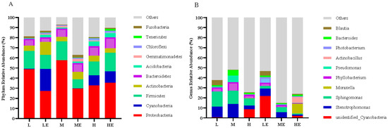 We used the T-test to analyze the differences in intestinal floral of grouper taxa between the group without and with enzymes (Figure 5). As shown in Figure 5A, the relative abundance of Alistipes in Group ME was significantly higher than that in the M group; as shown in Figure 5B, the relative abundance of Devosia and Myroides in Group LE was significantly lower than that in the L group (p < 0.05).