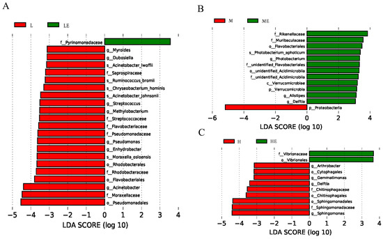 We used linear discriminant analysis (LDA) to analyze the differences in intestinal floral of grouper taxa between the group without and with enzymes (Figure 6). The results of Lef Se analysis showed that the abundance of Pyrinomonadaceae were significantly higher in Group LE than in Group L (p < 0.05, Figure 6A); the abundance of Rikenellaceae, Muribaculaceae, Flavobacteriales, Photobacterium, Acidimicrobiia, Verrucomicrobiae, and Alistipe was significantly higher in Group ME than in Group M (p < 0.05, Figure 6B); the abundance of Vibrionaceae and Vibrionales was significantly higher in Group HE than in Group H (p < 0.05, Figure 6C).