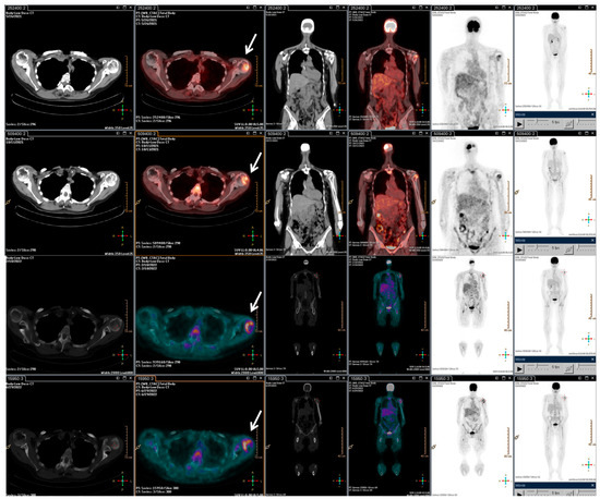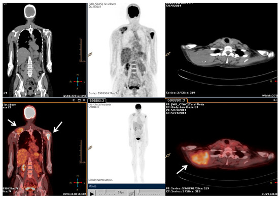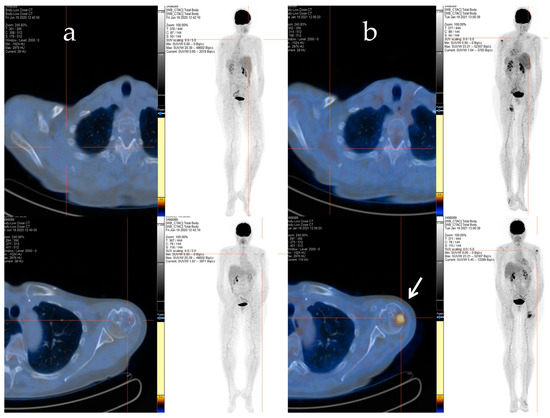 Afterwards, radiation therapy to the cervical segment (C4–C6) and left humerus (20 Gy/5 fractions) was performed, and a chemotherapy regimen consisting of epirubicin and ifosfamide was started. Despite an initial positive response after six cycles of treatment, signs of bone and soft tissue progression were apparent three months after the chemotherapy ended. Thus, the patient received a second-line treatment with trabectedin (1.5 mg/m2 q21), which was administered as a 24 h infusion every 3 weeks. After 48 cycles of treatment, despite the stable disease, the patient decided to discontinue the treatment due to severe fatigue, and a close follow-up was started. The patient maintained stable disease until January 2021 when a PET/CT scan revealed an increased uptake in the left proximal humerus (Figure 2a,b), right scapula, sternal manubrium, right iliac bone, and ipsilateral acetabulum.