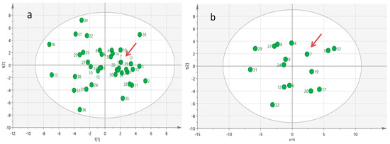Multivariate Principal Component Analysis (PCA) generated from serum metabolomics profiles of all 39 mSTS patients (a) and from 16 more homogeneous mSTS patients selected by L-sarcomas histotype (b). The red arrows indicate the case index.