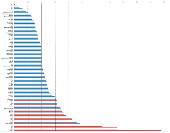 Fold change plot of serum metabolites and biohumoral parameters of the index case compared with the median values achieved from the remaining 38 mSTS patients. In red are indicated the bile acids that exceeded at least 1.5 times the average value.
