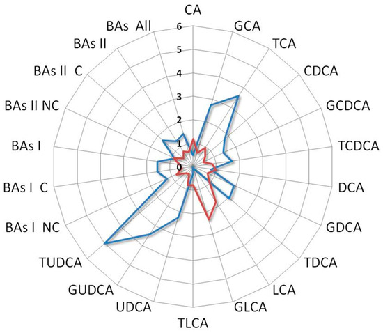 Radar plot of the BAs fold change levels of the index case compared with median levels of mSTS patients. All patients underwent second-line chemotherapy and were stratified by histotype as L-sarcomas (blue line) and Other-sarcomas, (red line). Cholic acid (CA), glycocholic acid (GCA), taurocholic acid (TCA), chenodeoxycholic acid (CDCA), glycochenodeoxycholic acid (GCDCA), taurochenodeoxycholic acid (TCDCA), deoxycholic acid (DCA), glycodeoxycholic acid (GDCA), taurodeoxycholic acid (TDCA), lithocholic acid (LCA), glycolithocholic acid (GLCA), taurolithocholic acid (TLCA), ursodeoxycholic acid (UDCA), glycoursodeoxycholic acid (GUDCA), tauroursodeoxycholic acid (TUDCA), non-conjugated primary bile acids (BAs I NC), conjugated primary bile acids (BAs I C), total primary bile acids (BAs I), non-conjugated secondary bile acids (BAs II NC), conjugated secondary bile acids (BAs II C), total secondary bile acids (BAs II), total bile acids (BAs).