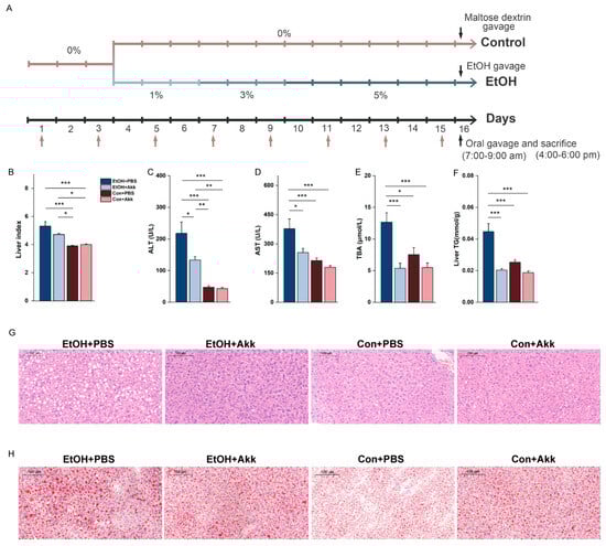 Specific pathogen-free C57BL/6 mice (female, age 10–12-week-old) were obtained from Shanghai Laboratory Animal Center (Shanghai, China). All experimental procedures commenced following the approval of the Institutional Animal Care and Use Committee of Shanghai Chedun Experimental Animal Breeding Farm (Approval number: ADO23003). All mice were housed in a controlled environment (20–22 °C, 40–60% humidity, 12 h light/dark cycle). Alcohol liver injury was induced in the mice using the NIAAA model with minor modifications [24]. After a 1-week acclimatization, the mice were fed a Lieber-DeCarli diet containing 1–5% vol% (TROPHIC Animal Feed High-tech Co., Ltd., Nantong, China) for 15 days [21,24]. The ethanol-fed or pair-fed mice were treated with A. muciniphila (2 × 108 CFU/200 µL PBS) or PBS by intragastric infusion with a 24-gauge stainless steel free tube every other day, starting on day 1. On the last day of the experiment, the pair-fed mice received 5 g/kg maltose, and the ethanol-fed mice received 5 g/kg ethanol-water. Nine hours after the ethanol or maltose gavage, the mice were sacrificed. The blood was collected from the inferior vena cava and then centrifuged at 3000× g for 15 min at 4 °C for serum collection. Cecal contents and tissue samples of the cecum and colon were collected. Livers were carefully weighed and snap-frozen with liquid nitrogen. All the samples were stored at −80 °C immediately after collection for further analysis.