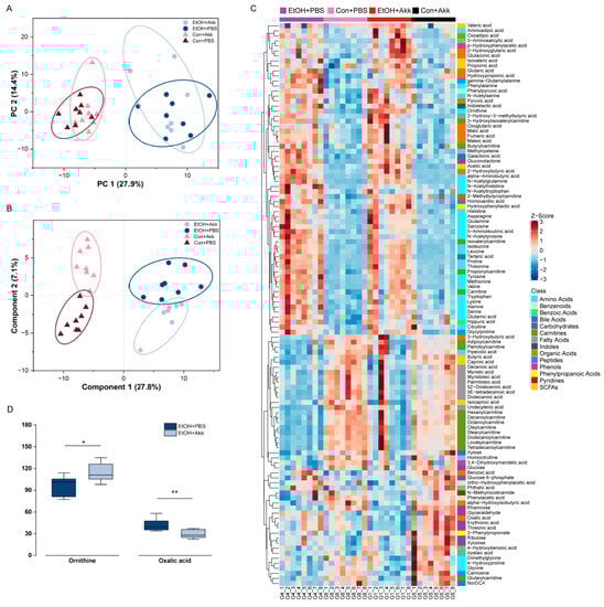 Effects of A. muciniphila interventions on the serum metabolism. (A) The PCA score plot and (B) PLS-DA score plot of metabolites from EtOH+Akk, EtOH+PBS, Con+Akk, and Con+PBS groups; (C) Clustering heatmap of the metabolism of the four groups; (D) Differential metabolite ornithine and oxalic acid content in groups EtOH+PBS and EtOH+Akk. * p < 0.05, ** p < 0.01.