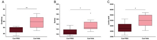 To study how A. muciniphila intervention affects host metabolism, we analyzed the compositions of plasma metabolites using targeted metabolomics. First, principal component analysis (PCA) and partial least squares discriminant analysis (PLS-DA) were conducted to reveal a clear separation between the ethanol-treated group and the control group (Figure 2A,B). PCA showed a trend of altered metabolic patterns in the absence or presence of A. muciniphila (Figure 2A). PLS-DA revealed distinct serum metabolic patterns resulting from A. muciniphila and PBS-treated mice (Figure 2B). The metabolomics data analysis, using a clustering-based heatmap approach, revealed significant differences among groups after ethanol treatment or supplementation with A. muciniphila (Figure 2C). Metabolites responsible for the differences were identified using variable significance projection (VIP > 1) and Student’s t test (p < 0.05). We observed a significant increase in ornithine content in the serum of the ethanol-fed mice after A. muciniphila administration, accompanied by a marked decrease in oxalic acid content (Figure 2D). Additionally, the levels of ornithine, serine, and lactic acid increased noticeably in the Con+Akk group compared to the Con+PBS group (Figure 3). These results indicated that supplementation with A. muciniphila induced changes in the serum metabolic patterns.