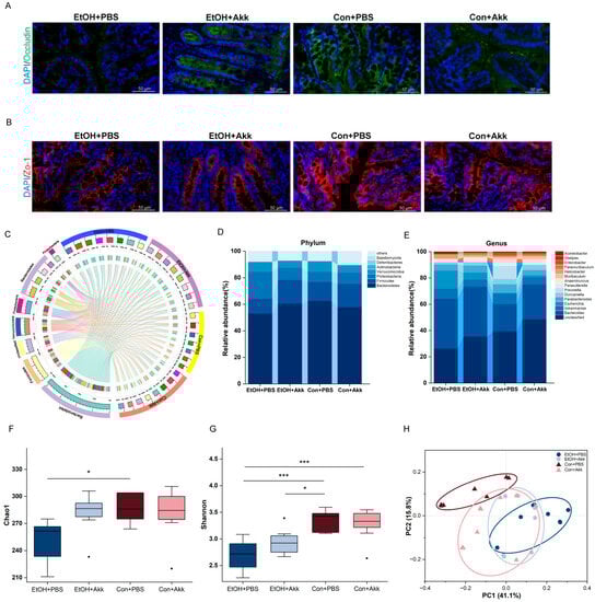 Effects of A. muciniphila intervention on intestinal barrier and gut microbiota in mice. (A) Immunofluorescence staining of occludin in the colon; (B) Immunofluorescence staining of Zo-1 in the colon; (C) The Circos plot showing the composition of gut microbiota in each group; (D) Mean relative abundance of the most abundant phyla and (E) genera in the cohort population gut microbiome; (F) Alpha diversity analysis using Chao1 index and (G) Shannon index; (H) Beta diversity analysis using PCoA of the gut microbiota based on Bray–Curtis dissimilarities. * p < 0.05 and *** p < 0.001.