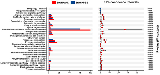 To further explore the biological functions, the most different top thirty KEGG pathways between EtOH+Akk and EtOH+PBS comparisons were generated by the PICRUSt algorithm (Figure 7). A. muciniphila administration upregulated many pathways, including arginine and signaling pathways, biofilm formation, butanoate metabolism, degradation of aromatic compounds, fatty acid degradation, etc. This result indicated that A. muciniphila altered the functional capabilities of the intestinal microbial community in mice fed with ethanol.