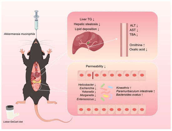 Diagram of the mechanism by which A. muciniphila improves ALD. A. muciniphila improves ALD by altering host metabolism and regulating the gut microbiota. “↑” represents increase and “↓” represents decrease.