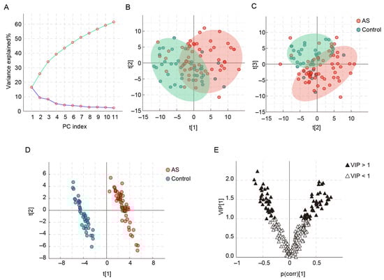 PCA and OSC PLS–DA of AS patients and healthy controls based on serum metabolic profiles. (A) PCA scree plot, (B) PCA score plot of PC1 and PC2, (C) PCA score plot of PC2 and PC3, (D) OSC PLS–DA score plot, and (E) V plot.