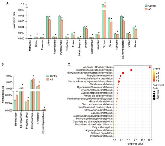 Differential metabolites and enrichment pathways in serum of AS patients and healthy controls. (A) Down-regulated metabolites in serum of AS patients, (B) up-regulated metabolites in serum of AS patients, (C) enriched pathways. * represents p < 0.05 between controls and AS patients.