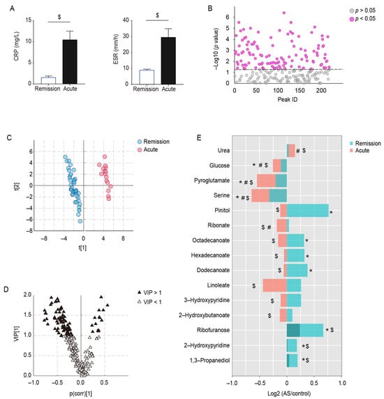 Metabolic differences between acute- and remission-stage patients with AS. (A) Differences in CRP and ESR in AS patients during different stages, (B) ANOVA of serum metabolites between controls, AS patients in the remission stage, and AS patients in the acute stage. (C) OSC PLS–DA score plot of AS patients in remission versus acute stages, (D) OSC PLS–DA V plot. (E) Trends of serum metabolites in AS patients during acute and remission stages. * represents p < 0.05 between controls and AS patients in the remission stage, # represents p < 0.05 between controls and AS patients in the acute stage, and $ represents p < 0.05 between AS patients in acute and remission stages.