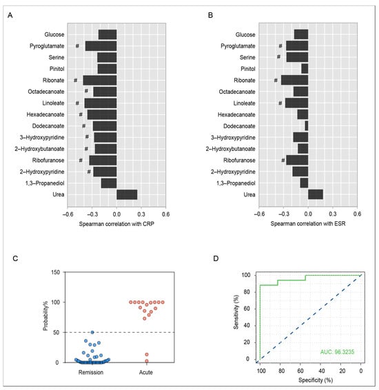(A) Spearman correlation coefficient of serum differential metabolites and CRP index in AS patients during the remission and acute stages. # indicates a statistically significant correlation. (B) Spearman correlation coefficient of serum differential metabolites and ESR index in AS patients during the remission and acute stages. # indicates a statistically significant correlation. (C) Predictive probability of acute AS patients and remission patients based on serum differential metabolites. Individuals below the blue dashed line are predicted to be in remission stage, and those above the blue dashed line are predicted to be in the acute stage. (D) ROC analysis for the discrimination of AS patients during different stages using the combination of serum 2-hydroxybutanoate and hexadecanoate levels. The blue dashed line is the reference line for performance, and the ROC curve above the diagonal means the performance of the model is relatively good.