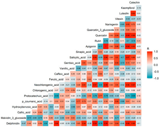 Correlation plot of the phenolics in adzuki bean leaves. The values in each square represent the Pearson R correlation coefficients. Correlation coefficients above 0.47 or below −0.47 were considered statistically significant at α = 0.05.