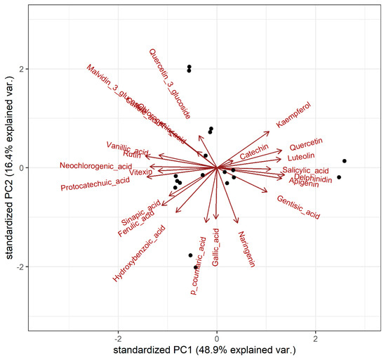 Scores plot of principal component analysis for leaf phenolic contents, based on the centred log-ratio transformed data.