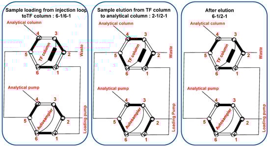 The loading pump used two different solvents, an aqueous solution of formic acid (0.1%, v/v) and ammonium acetate (2 × 10−3 mol·L−1) (in C) to allow the sample to be loaded on the TF column, and an equi-volume mixture of water/methanol/isopropanol/acetonitrile (in D) to clean the system after elution of compounds from the TF to the analytical column.