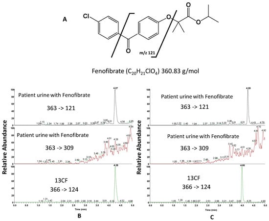 (A) Fenofibrate and daughter ion m/z 121 []. (B) Accucore® C18 column and from top to bottom: chromatograms obtained after injection of urine from a patient treated with fenobibrate (transition of cortisol quantification (363 → 121) and qualification (363 → 309) spiked with a 13CF solution (366 → 124). (C) Accucore Polar Premium® column and from top to bottom: chromatograms obtained after injection of patient urine treated with fenobibrate (transition of quantification and qualification) spiked with a solution of 13CF.