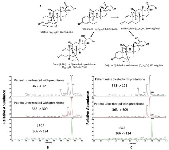 (A) Cortisol isomers, metabolites of prednisone and prednisolone likely to appear in patients treated with prednisone. (B) Accucore® C18 column and from top to bottom: chromatograms obtained after injection of urine from a patient treated with prednisone (transitions for quantification (363 → 121) and qualification (363 → 309) of cortisol) spiked with a 13CF solution (366 → 124). (C) Accucore Polar Premium® column and from top to bottom: chromatograms obtained after injection of urine of patient treated with prednisone (transitions of quantification and qualification for cortisol) spiked with a solution of 13CF.