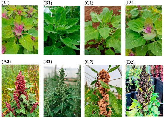 Quinoa (Chenopodium quinoa Willd., 2n = 4X = 36) is an annual dicotyledonous, self-pollinating herbaceous plant belonging to the Amaranthaceae family (Chenopodium). It is an allotetraploid with alternating single leaves and clustered inflorescence. The leaves are shaped like duck palms, and the leaf margins are divided into full and serrated types [1,2,3,4,5]. Originating in the Andes Mountains of South America, quinoa has been cultivated for 5000–7000 years. Quinoa, known as a “golden grain”, belongs to the Chenopodiaceae family alongside spinach (Spinacia oleracea L.) and sugar beet (Beta vulgaris L.) [6,7]. It is globally popular owing to its comprehensive nutritional value, high functional value, strong stability, and ecological adaptability [8]. The Food and Agriculture Organization of the United Nations has recognized quinoa as the only single and non-genetically modified crop that can meet the nutritional needs of humans [9,10,11]. Quinoa protein has a balanced amino acid composition and multiple functional activities, such as lowering cholesterol and inhibiting α-glycosidase. Moreover, quinoa is rich in high-quality proteins, healthy oils, saponins, polyphenols, and flavonoids and is, thus, a beneficial addition to a healthy diet [12].