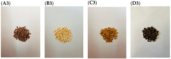 (A1–D1): Differences in seedling cultivars of red, white, black, and yellow quinoa; (A2–D2): Differences in grouting period cultivars of red, white, black, and yellow quinoa; (A3–D3): Differences in seed maturity cultivars of red, white, black, and yellow quinoa.