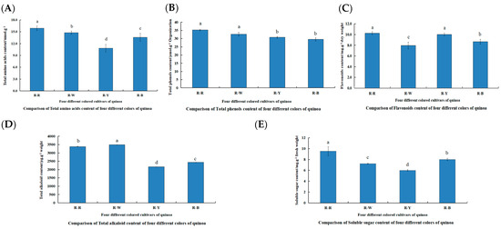 Comparison of physiological indicators between and within R–R, R–W, R–Y, and R–B (A–E). (A): Comparison of total amino acid content of four different colors of quinoa; (B): comparison of total phenol content of four different colors of quinoa; (C): comparison of flavonoid content of four different colors of quinoa; (D): comparison of total alkaloid content of four different colors of quinoa; and (E): comparison of soluble sugar content of four different colors of quinoa. Different lowercase letters denote a significant difference at the 0.05 level (p < 0.05).