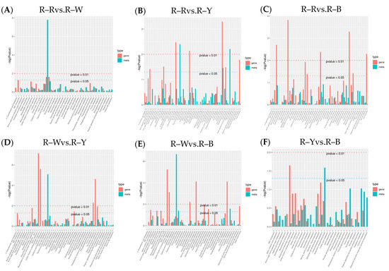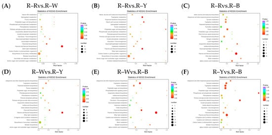 The Venn diagram shows the overlap of differential genes among the different comparative combinations, and the differential genes that were common or unique to certain comparative combinations can be screened using different groupings of differential gene Venn diagrams (Figure S10). To understand the biological functions of the DEGs, GO (Gene Ontology) term enrichment was performed using BLAST-GO. The results identified 2370 (R–Rvs.R–W), 4507 (R–Rvs.R–Y), 3125 (R–Rvs.R–B), 6473 (R–Wvs.R–Y), 4436 (R–Wvs.R–B), and 1492 (R–Yvs.R–B) DEGs, which were divided into 59 functional groups, including 28 biological process categories, 18 cellular component categories, and 13 molecular function categories (Figure 6A–F). The six comparison groups were shown to have different percentages of the three components, which may also be a key factor in regulating the genetic differences between multiple groups of different quinoa seedling stages. To further identify the metabolic pathways associated with the DEGs, KEGG enrichment analysis was performed. Four common differential genes, 296 (R–Rvs.R–W), 802 (R–Rvs.R–Y), 357 (R–Rvs.R–B), 1729 (R–Wvs.R–Y), 752 (R–Wvs.R–B), and 204 (R–Yvs.R–B) DEGs, were assigned to 126, 131, 134, 136, 134, and 109 KEGG pathways, respectively (Figure 7A–G). Among these, 11, 10, 17, 22, 25, and 20 pathways were significantly enriched (p < 0.05, Tables S16–S21). A scatter plot was generated to provide a graphical presentation of the results of the KEGG enrichment analysis, notably starch and sucrose metabolism, plant-pathogen interactions, alpha-linolenic acid metabolism, phenylpropanoid biosynthesis, flavonoid biosynthesis, and anthocyanin biosynthesis in the six comparison groups were significantly enriched to different degrees (Figure 7A–F). In addition, these enriched pathways were further classified into five categories: cellular processes, environmental information processing, genetic information processing, metabolism, and organism systems. Among the five categories, the metabolism category contained the largest number of pathways in all three comparison groups (Figure S11). New transcript information was extracted from the comparison results of the spliced transcripts with genome annotations, and new gene functions were annotated with 4368 new genes that required mining (Table S22).