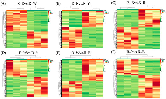 Functional annotation was performed on the detected genes using the KEGG, GO, NR, SwissProt, KOG, Pfam, and Tremble databases. Functionally annotated genes were reported with KEGG (38,122), GO (38,862), NR (49,088), SwissProt (32,844), KOG (46,755), Pfam (42,765), and Tremble (47,789) analyses and involved 142 pathways. Differentially expressed gene analysis was completed using DESeq2, based on the pairwise comparison with a |log2 (fold change)| of ≥1 and FDR value of <0.05 as the threshold. The results showed that R–Rvs.R–W, R–Rvs.R–Y, R–Rvs.R–B, R–Wvs.R–Y, R–Wvs.R–B, and R–Yvs.R–B detected 2370 (1052 up- and 1318 downregulated genes in R–R), 4507 (1915 up- and 2592 downregulated genes in R–R), 3125 (1365 up- and 1760 downregulated genes in R–R), 6473 (2927 up- and 3547 downregulated genes in R–W), 4436 (2487 up- and 1949 downregulated genes in R–W), and 1492 (905 up- and 587 downregulated genes in R–Y) genes (Table 5, Tables S16–S21), and MA plots were used to visualize the overall distribution of the gene expression levels and differential ploidy (Figure S9). The FPKM expression, after extracting the differential genes centrally and normalizing and performing hierarchical clustering analysis of the clustering heat map, shows that the clustering results differed among the different varieties of differential genes with high expression levels (Figure 5).