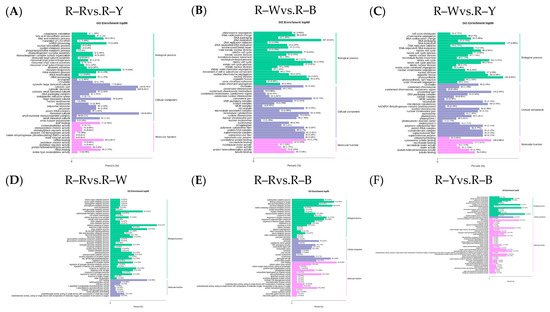 (A–F): GO enrichment analysis of the differential genes in different groups. Note: The horizontal axis represents the proportion of the annotated genes to the total number of annotated genes, while the vertical axis represents the name of the GO entry. The label on the right side of the graph represents the classifications to which the GO items belong.