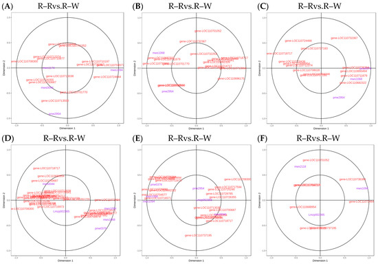 (A–F): Flavonoid biosynthesis CCA diagrams. Note: The four regions are divided by crosses, and the farther away from the origin and closer to each other in the same region, the higher the correlation.