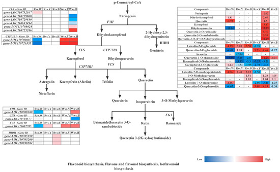 Furthermore, integrated analysis of the differential synthesis pathways (flavone and flavonol biosynthesis, flavonoid biosynthesis, and isoflavonoid biosynthesis) in six comparative groups of different quinoa cultivars (R–R, R–W, R–Y, and R–B) revealed that R–Rvs.R–W and R–Wvs.R–B had the highest levels of metabolites, and only these two groups were significantly enriched in flavonoid biosynthesis; tryptophan metabolism was only enriched in R–Bvs.R–Y. Cluster analysis of the up and downregulated genes FPKM of key enzyme points in the pathway simultaneously showed that the 14 structural genes contained six FLS (gene-LOC110732367, gene-LOC110729868, gene-LOC110729880, gene-LOC110693494, gene-LOC110708028, and gene-LOC110725246), two CYP75B1 (gene-LOC110700687 and gene-LOC110726355), 1 CHI (gene-LOC110708300), 1 CHS (gene-LOC110704577), 1 FG3 (gene-LOC110687785), and 3 HIDH (gene-LOC110705190, gene-LOC110705200, and gene-LOC110698584), which are the major structural genes in the flavonoid biosynthesis pathway, for flavone and flavonol biosynthesis, and isoflavonoid biosynthesis (Figure 12). Gene-LOC110687785 and gene-LOC110700687 were unmistakably two important differential genes. Overall, R contained more differential metabolites than W, Y, and B, and 29 differential metabolites were detected most frequently in R, and 19 genes were strongly associated with them (Table 8).