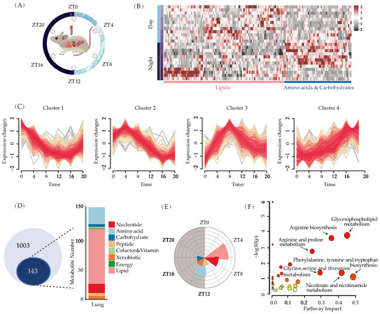 Next, we analyzed the rhythm of respiratory metabolism. Temporal clustering analysis of 1003 measured metabolites revealed that certain metabolites peaked during the day, whereas others peaked at night, exhibiting rhythmic oscillations over time (Figure 2C). Specifically, 143 metabolites in the lung tissue have rhythmic oscillations, with lipid and amino acid metabolites exhibiting the most notable alterations (Figure 2D). Lipids, nucleic acids, and peptides attained their peak levels during the day, whereas amino acids and carbohydrates peaked at night (Figure 2E). These results indicate a relationship between the metabolic properties of these substances and their temporal regulation. For instance, it is known that lipid metabolism species exhibit daily cycles, with higher levels of nonesterified fatty acids (NEFA) in the circulation of rodents during their inactive phase [39,40], while during the awake phase, circulating amino acid levels are elevated, serving as substrates and stimuli for protein synthesis [41]. The metabolic pathways of glycerophospholipid, arginine, proline, phenylalanine, tyrosine, tryptophan, and glycine-serine-threonine are enriched in these rhythmic metabolites (Figure 2F). Together, under physiological conditions, these data indicate a circadian oscillation of a specific metabolite in the lungs.