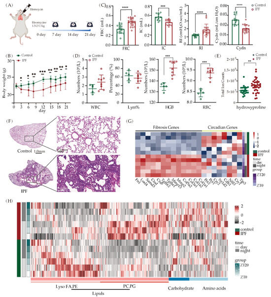 Lung rhythm oscillations in mice with IPF. (A) Schematic of IPF modeling. (B) Body weight changes during IPF progression in mice (IPF, n = 28; PBS, n = 6, * p < 0.05, ** p < 0.01, and *** p < 0.001). (C) Lung function in IPF mice. FRC: Functional Residual Capacity; IC: Inspiratory Capacity; RI: Resistance to Inhalation; Cydn: Dynamic Lung Compliance. (IPF, n = 20; PBS, n = 15, *** p < 0.001, **** p < 0.0001). (D) Changes of blood routine parameters in IPF mice. WBC: White Blood Cell Count; Lym%: Lymphocyte Ratio; HGB: Hemoglobin; RBC: Red Blood Cell Count. (n = 8, *** p < 0.001). (E) The detection of hydroxyproline in mice with IPF (n = 36, ** p < 0.01). (F) HE staining of lung tissue section from control mice and IPF mice. (G) Heatmap of genes related to fibrosis and circadian rhythm. (H) Temporal clustering curve of metabolites changes (n = 6).