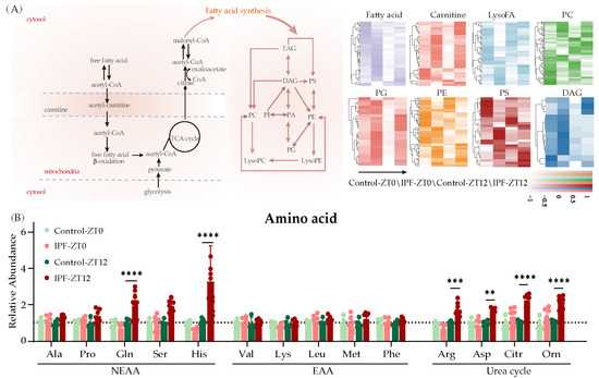 To gain a detailed understanding of the rhythmic oscillation of metabolites in IPF, we examined metabolite alterations classified using pathway separately. Lipid metabolism, which includes fatty acids, cholesterol, carnitine, etc., are essential components of cell membranes and play a crucial role in maintaining lung energy homeostasis. It has been reported that the dysregulation of lipid metabolism inhibits the regeneration of alveolar epithelial cells and promotes the transformation of fibroblasts into myofibroblasts, thereby contributing to the development of fibrosis [43,44]. Figure 4A exhibited the lipid changes in lung tissue (Figure 4A). There were significant differences in the concentrations of free fatty acid and carnitines between IPF and control groups at ZT0 and ZT12. Specifically, the level of free fatty acid reached its peak at ZT0, while carnitines had the maximum levels at ZT12. Moreover, a generally elevated level of these metabolites was observed in the presence of fibrosis. This suggests that the lungs with fibrosis either utilize less fatty acid oxidation for energy production or derive more lipid hydroxylation to maintain the fatty acid pool. Another observation was a disorder in the metabolism of PC, PE, and phosphatidylserine (PS). The majority of these lipids exhibit a distribution pattern opposite to that of IPF, while their circadian rhythm remains relatively unchanged. Diacylglycerol (DAG), an intermediate in the synthesis of PE and PS [43,45], appeared to dysregulate substantially at ZT0 but exhibited less pronounced changes at ZT12. These findings are supported by previous research from Yidan D. Zhao [46]. They analyzed a total of eight lung samples from individuals with IPF and eight lung samples from healthy donors, and their results were consistent with ours, demonstrating the dysregulation of lipid metabolism in IPF. However, when examining the energy production cycle, the tricarboxylic acid (TCA) cycle, we found that the levels of the majority of cycle intermediates were not significantly elevated between control and IPF; their metabolic rhythm was likewise stable (Figure S4A). Since amino acids (AAs) are another essential energy source and play a crucial role in cell signaling, we investigated the time dependencies of IPF’s effect on AAs metabolism [47]. Both essential and non-essential AAs were checked (Figure 4B), and the bar graph analysis revealed that their metabolism was strongly influenced by the time of day during IPF formation. The levels of glutamine, glutamate, serine, and tyrosine increased significantly at ZT12. Histidine levels decrease at ZT0, whereas rise at ZT12 (Figure S5A). Increased collagen deposition is a characteristic of fibrotic lung diseases. Glutamine, glutamate, and serine are all necessary for collagen synthesis [48]. It has been reported that histidine variation is associated with lung microbiota metabolism [49]. Histidine-rich glycoprotein (HRG) diets can promote the development of IPF [50]. Our findings highlight the complex dysregulation of lipid and amino acid metabolism along with circadian rhythm and fibrosis. Understanding the specific molecular mechanisms underlying these alterations could aid in the establishment of targeted treatments for pulmonary fibrosis.