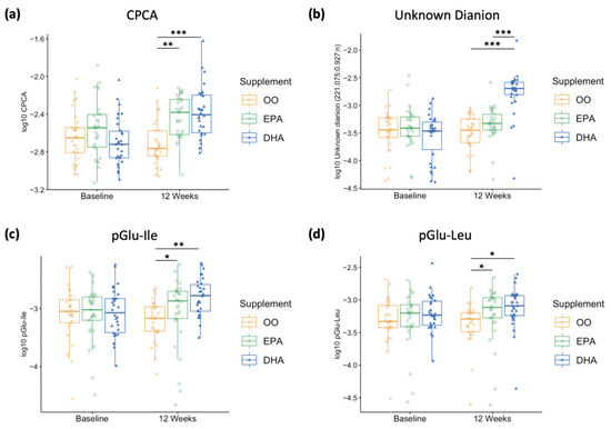 Creatinine-normalized urinary metabolite responses after log10 transformation for (a) S-carboxypropylcysteamine (CPCA, 164.074:0.613:p), (b) an unknown dianion (221.075:0.927:n), and (c,d) a dipeptide tentatively identified as pGlu-Ile and pGlu-Leu, respectively, at baseline and final (12 weeks) for olive oil (OO, yellow), EPA (green), and DHA (blue). Mean group differences were analyzed with 2-factor repeated measures ANOVA for CPCA and Kruskal–Wallis test for the others. Post hoc Bonferroni-adjusted results between each supplement group are reported, (*) p < 0.05, (**) p < 0.001 and (***) p < 0.0001. OO = olive oil, EPA = eicosapentaenoic acid, DHA = docosahexaenoic acid, pGlu-Ile = pyroglutamylisoleucine, pGlu-Leu = pyroglutamylleucine.