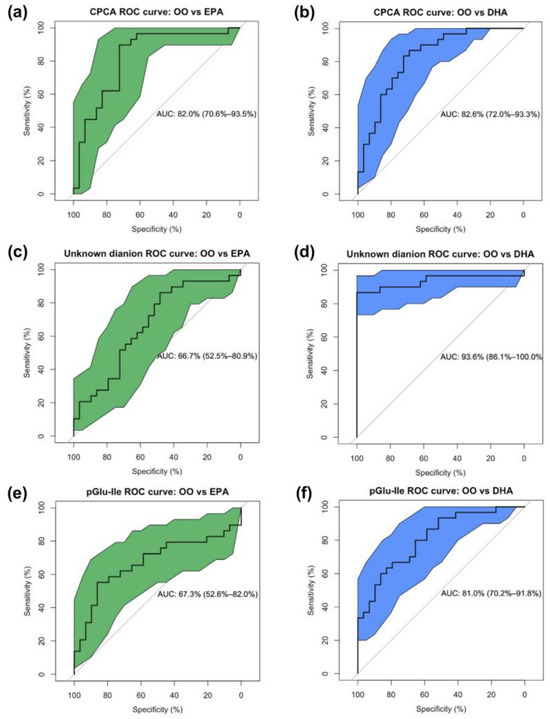 ROC curves of the sensitivity and specificity of creatinine-normalized urinary metabolites to classify OO vs. EPA (confidence interval in green) and OO vs. DHA (confidence interval in blue) at 12 weeks; (a) CPCA AUC = 82.0% and (b) 82.6%; (c) an unknown dianion (221.075:0.927:n) AUC = 66.7% and (d) 93.6%; and (e) pGlu-Ile AUC = 67.3% and (f) 81.0%, respectively. CPCA = S-carboxypropylcysteamine, pGlu-Ile = pyroglutamylisoleucine.