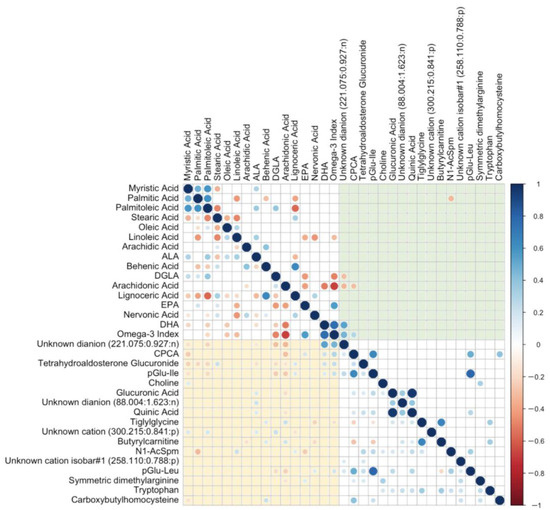 Correlation plot of relative % fatty acids in erythrocytes and top 17 selected metabolites, where significant (p < 0.05 below diagonal, Padj < 0.05 above diagonal) correlations are indicated by sphere size (strength) and colour (blue = positive, red = negative). Nonsignificant correlations are depicted by blank cells. Urinary metabolites with significant un-adjusted correlations to erythrocyte fatty acids are depicted in the bottom left quadrant (yellow); urinary metabolites with significant adjusted correlations to erythrocyte fatty acids are depicted in the top right quadrant (green). ALA = α-linolenic acid, DGLA = di-homo-γ-linolenic acid, EPA = eicosapentaenoic acid, DHA = docosahexaenoic acid, CPCA = S-carboxypropylcysteamine, pGlu-Ile = pyroglutamylisoleucine, pGlu-Leu = pyroglutamylleucine, N1-AcSpm = N1-Acetylspermidine.