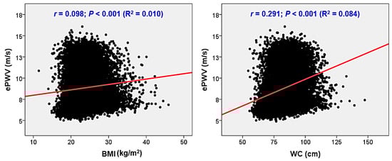 Continuous variables were displayed as mean ± standard deviation, and categorical ones as numbers and percentages (n%). The relationships between ePWV and both BMI and WC were assessed via Pearson correlation analysis. The results of this analysis were then visually represented using scatter plots to easily discern patterns and trends. The relationships between ePWV and both BMI and WC were determined using multivariable linear regression and binary logistic regression analysis. For the linear regression, several clinical covariates were adjusted, including age, sex, systolic BP, glycated hemoglobin, low-density lipoprotein cholesterol, smoking habits, glomerular filtration rate, and uric acid levels. On the other hand, the binary logistic regression analysis made adjustments for age, sex, hypertension, diabetes mellitus, smoking habits, glomerular filtration rate, and uric acid levels. These adjustments ensured a comprehensive understanding of how BMI and WC independently relate to ePWV, accounting for a range of potential confounding factors. It is crucial to adjust for these variables to achieve a more accurate and nuanced insight into the association between obesity metrics and arterial stiffness. In the multivariate linear analysis, multicollinearity was assessed using the variance inflation factor (VIF), and the VIF values for all independent variables were below 4 [37]. In the multivariate binary logistic regression analysis, the dependent variable was determined based on the median value of ePWV. BMI and WC were categorized into tertiles and used as independent variables. To assess the goodness of fit for the logistic regression model, we utilized the Hosmer–Lemeshow Goodness of Fit test, with all resulting p-values being greater than 0.05 [38]. All analyses were two-tailed, with a p-value less than 0.05 indicating statistical significance. All statistical analyses were conducted using SPSS version 26.0 (IBM Co., Armonk, NY, USA).