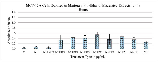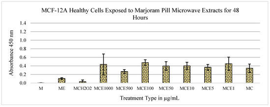 Effects of marjoram pills at an absorbance of 450 nm on MCF-12A cell line for 48 h. Where “M” is medium only, “E” is extract, “C” is cells, “H2O2” is hydrogen peroxide, and the following numbers correspond to the treatment type in μg/mL.
