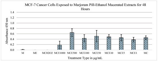 As shown in Figure 1, the marjoram extracts exert cytotoxic effects on the MCF-7 cells at the 1000 μg/mL concentration. A control of cells with medium alone was significantly different (p = 7.16 × 10−6). The data also show a statistically significant drop between the 500 μg/mL and 1000 μg/mL concentrations (p = 8.94 × 10−5). Thus, it can be concluded that between the concentrations of 500 and 1000 μg/mL, marjoram extracts have cytotoxic effects on MCF-7 breast cancer cells.