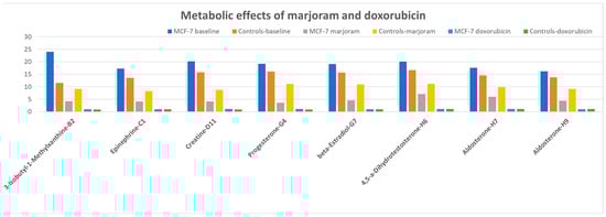 The most remarkable results produced by marjoram extracts were observed in the presence of metabolic effectors. While at baseline, MCF-7 cells showed a significantly higher production of NADH than controls in response to stimulant/catabolic compounds, such as methylxanthine and epinephrine, and steroid hormones such as progesterone, estradiol, testosterone, and aldosterone. After exposing the cells to marjoram extracts, the energy production in cancerous cells was reduced without significant changes in control cells, leading to an inversion of the ratio between MCF-7 and the controls (Figure 6). These data suggest an important role of marjoram’s phytochemicals in cellular pathways regulating the response to key metabolic effectors and paving the way to future studies exploring further molecular targets for the therapeutic application of these compounds.