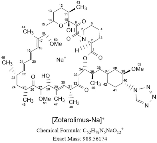 The acquired MS-TOF spectra of zotarolimus and its metabolites in positive ion mode showed several adduct ions with sodium adducts having the highest intensity. This had also been observed in other studies with structurally related drugs such as sirolimus, everolimus, temsirolimus, and SAR-943 [13,16,17,18,19]. Additives, such as formic acid used in the mobile phase, may have facilitated the formation of the preferred sodium adducts. Moreover, the addition of ammonium formate or ammonium acetate without formic acid did not suppress the formation of sodium adduct ions.