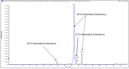 The compounds underlying the metabolite peaks with the main peaks having retention times of 34.85, 46.72, and 47.27 min (Figure 5) showed a molecular ion [M+Na]+ of m/z = 974.54609. This indicated demethylation of zotarolimus ([M+Na]+ m/z = 988.56174). The high-resolution mass spectrum of the metabolite with a retention time of 34.85 min is shown in Figure 6C. Comparison of the mass spectra of the metabolite underlying this peak with that of zotarolimus showed that the metabolite with the retention time of 34.85 min had fragments excluding O-demethylation at C(31): m/z = 369, 397, and 694 (the same as the corresponding zotarolimus fragments), whereas specific fragments confirming the presence of 16-O-desmethyl zotarolimus (m/z = 381, 409, 453, 928, and 755) were present in the MS/MS spectra of this metabolite (Figure 6C, for more detail please see page 104 of the Supplementary Materials). Furthermore, water elimination at the C(16) position enabled by the newly formed hydroxy group (m/z = 600 → 582, 471 → 453, and 427 → 409) confirmed 16-O-desmethyl zotarolimus. The calculated mass error (Δppm) for the observed key fragments were consistently below 3.8 ppm (please see Table 1 and the Supplementary Materials) indicating high mass accuracy of the proposed fragment structures and, thus, a high level of certainty of the structural identification of 16-O-desmethyl zotarolimus. Using a 5600+ high-resolution TOF mass spectrometer (Sciex, ON, Canada) with a resolution of 30,000 and an absolute mass error of <5 ppm allowed for confirmation of the proposed elemental composition of the fragment ions.