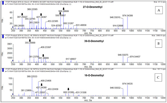 Representative MS/TOF high-resolution mass spectra of the demethylated zotarolimus metabolites (m/z 974.54609). 27-O-desmethyl zotarolimus (A); 39-O-desmethyl zotarolimus (B); 16-O-desmethyl zotarolimus (C). The arrows mark key fragments used for structural identification. For more details, please see the Supplementary Materials.