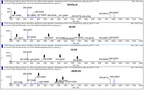 Representative mass spectra of hydroxylated zotarolimus metabolites (m/z 1004.55666), hydroxy-piperidine-, 25-hydroxy-, 12-hydroxy-, and 45/46-hydroxy-zotarolimus. The arrows mark key fragments used for structural identification. For more details, please see the Supplementary Materials.