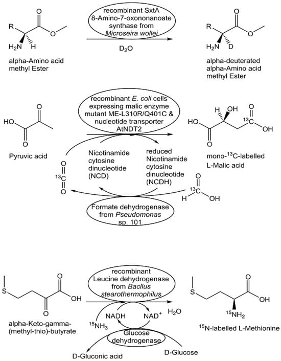 - Chiriaca, M.; Lupan, I.; Popa, F.; Palibroda, N.; Popescu, O. Enzymatic synthesis of some 15N-labelled L-amino acids. Isot. Environ. Health Stud. 2010, 46, 249–254. [Google Scholar] [CrossRef] [PubMed]
