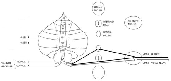 Schematic representation of Vestibulocerebellar connections (afferent pathways in black, efferent pathways in grey).