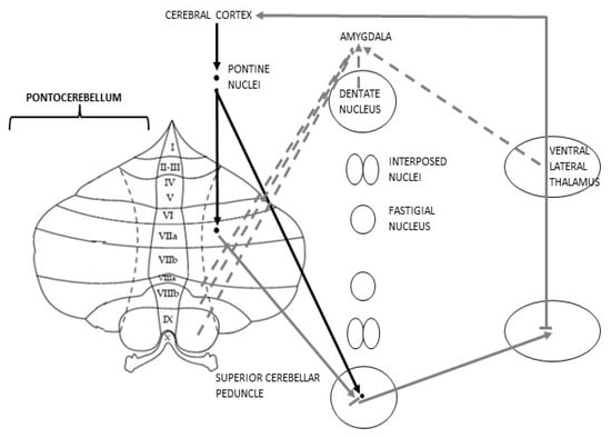 Furthermore, a study using rsfMRI conducted in monkeys and cats has proved the existence of a “bilateral limbic-cerebellar-amygdaloid network” consisting of connections among the dentate nuclei, the hemispheric part of lobule VIII–IX and Amg [,] (Figure 2).
