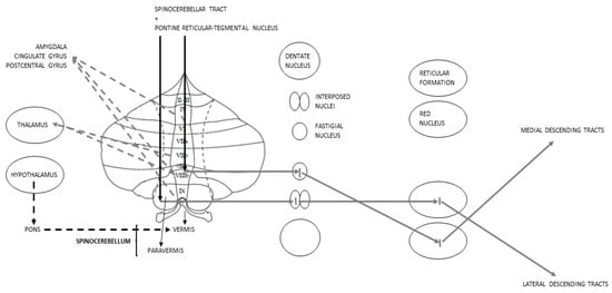 The sCbm, or Paleocerebellum, corresponds to the vermis and the intermediate parts of the hemispheres known as “paravermis”. It receives somatosensory inputs from the spinocerebellar tract and the pontine reticular-tegmental nucleus. Paravermis Purkinje cells make synapses on the interposed nuclei; from there information goes to red nucleus where, after making a decussation, the lateral descending systems start []. Vermis Purkinje cells, instead, project their GABAergic axons [] to the FN that sends inputs to the reticular formation, from where, through a decussation, the medial descending tracts begin, and to the PMC, passing through the ventral lateral nucleus of the Thl []. In addition to these pathways, vermis is a key juncture in processing emotional inputs: it is for this reason that the so-called “limbic Cbm” is identified with this area [,,]. In relation to this, it has been observed, in subjects with BD, a functional connectivity between the vermis, in particular the lobules V, VIIIb and X, and anatomical regions notoriously belonging to the LS, such as the postcentral gyrus, the cingulate gyrus and the Amg [,]. Furthermore, lobule VIIIb, along with VIIb, organizes direct connections with the Thl []. Even the Hyp is indirectly linked to sCbm: Hyp projections, in fact, through the medial portions of the pons, reach the vermis [] (Figure 3).